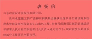 近日,公司總承包的廣西柳州鋼鐵集團(tuán)鎳鐵冶煉項(xiàng)目公輔設(shè)施系統(tǒng)廢水處理及雨水收集工程項(xiàng)目部收到業(yè)主表?yè)P(yáng)信,稱(chēng)贊項(xiàng)目部在安全、...