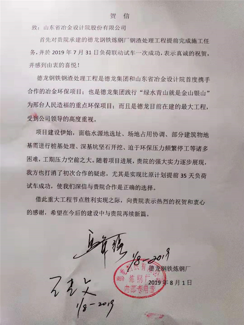 2019年7月31日14點58分,山冶設計總承包的德龍鋼鐵鋼渣處理項目負荷聯(lián)動試車一次成功!比原計劃工期提前35天!第二日,收到業(yè)主的賀信: