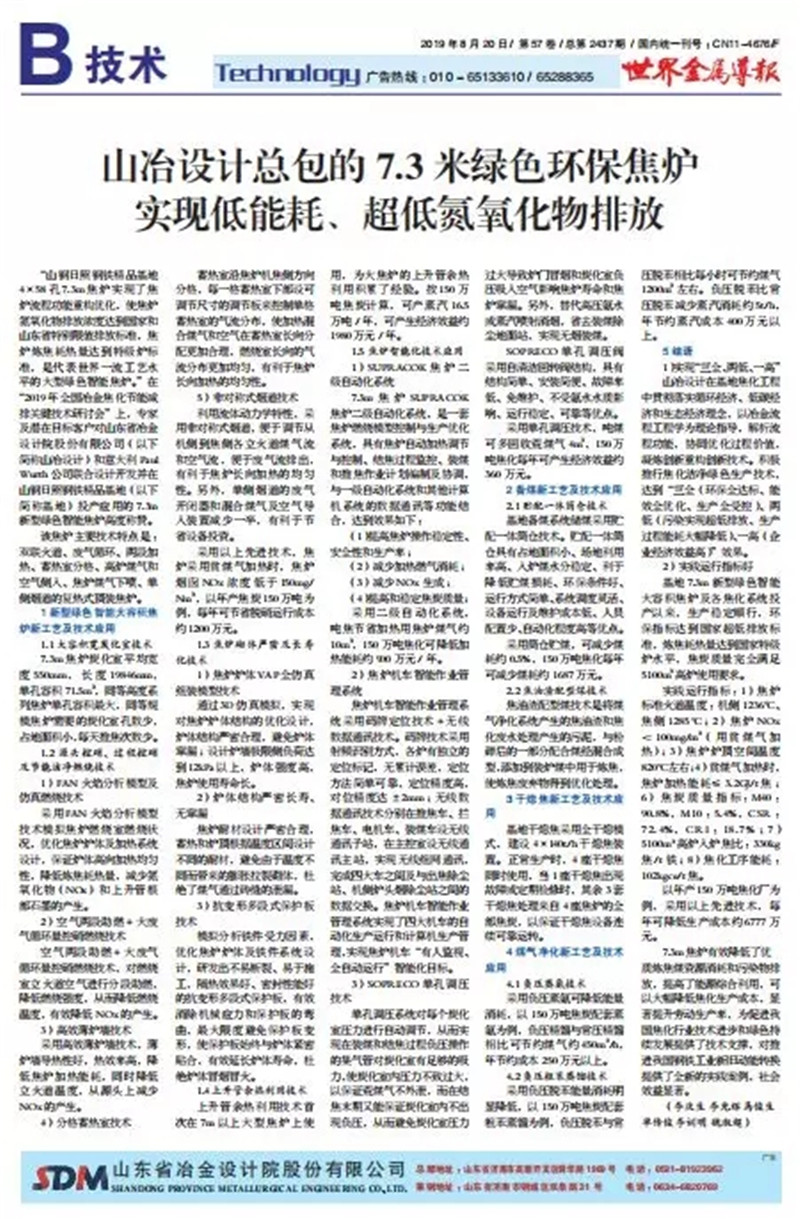 “SDM大型綠色智能焦爐技術(shù)”是山冶設(shè)計與意大利PW公司合作的代表世界一流工藝水平的大型焦爐技術(shù)。由山冶設(shè)計進行整體規(guī)劃及設(shè)計,采用了分段加熱、非對稱式煙道、薄爐墻、單孔調(diào)壓、火焰分析模型等技術(shù),具有技術(shù)成熟先進、結(jié)構(gòu)嚴密合理、單孔容量大、占地面積小、熱工效率高、自動化水平高、環(huán)保指標先進等諸多優(yōu)點。在焦爐爐體、焦爐機械、工藝裝備、自動化和環(huán)保水平等方面代表國際先進水平。同時,在世界上首次運用焦爐爐內(nèi)脫硝工藝,氮氧化物排放指標符合國家最嚴環(huán)保排放標準。
