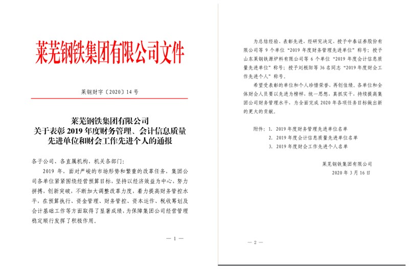 2020年3月16日,萊鋼集團下發(fā)“關于表彰2019年度財務管理、會計信息質(zhì)量先進單位和財會工作先進個人的通報”,山冶設計榮獲“2019年度財務管理先進單位”稱號,創(chuàng)研公司榮獲“2019年度會計信息質(zhì)量先進單位”稱號,山冶設計財務部萬同輝、創(chuàng)研公司財務部薛云榮獲“2019年度財會工作先進個人”稱號。