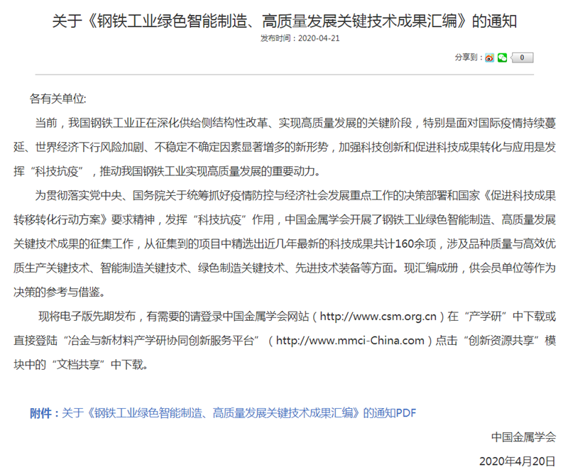 2020年4月21日,中國金屬學(xué)會發(fā)布了《鋼鐵工業(yè)綠色智能制造、高質(zhì)量發(fā)展關(guān)鍵技術(shù)成果匯編》,公司“清潔、高效、大型焦?fàn)t的應(yīng)用技術(shù)”、“焦化煤調(diào)濕技術(shù)及SDM-HB2干燥破碎機(jī)”、“一種高架式設(shè)計的熱連軋生產(chǎn)線”以及與山東墨龍石油機(jī)械有限公司聯(lián)合申報的“墨龍HIsmelt熔融還原工藝”共4項技術(shù)入選。