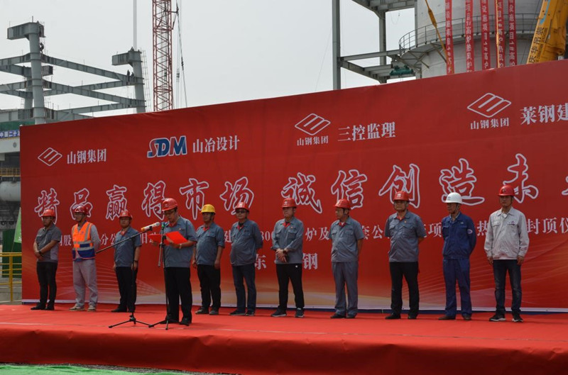 2020年6月28日9點50分,公司總包的山鋼股份萊蕪分公司新舊動能轉(zhuǎn)換項目1號3800m3高爐熱風(fēng)爐順利封頂!山鋼股份萊蕪分公司新舊動能轉(zhuǎn)換項目工程指揮部副指揮孫建設(shè),山鋼股份萊蕪分公司煉鐵廠經(jīng)理、高爐工程項目經(jīng)理部經(jīng)理張明,新舊動能轉(zhuǎn)換項目工程指揮部高爐工程項目經(jīng)理部常務(wù)副經(jīng)理賈友劍,萊蕪三控冶金建設(shè)監(jiān)理事務(wù)所經(jīng)理沈桂聯(lián),我公司黨委書記、副總經(jīng)理谷卓奇,萊蕪鋼鐵集團(tuán)建筑安裝工程有限公司黨委書記、董事長時元海,萊蕪鋼鐵集團(tuán)建筑安裝工程有限公司副經(jīng)理梁博,上海二十冶萊鋼高爐項目部項目經(jīng)理李虎,中國十九冶萊鋼高爐公輔項目部項目副經(jīng)理田澤龍,河北省安萊鋼高爐噴煤及鑄鐵機項目部項目經(jīng)理王紅帥,中十冶萊鋼主控樓項目部項目經(jīng)理馬少華出席了儀式。