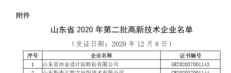 1月15日,根據(jù)全國高新技術企業(yè)認定管理工作領導小組辦公室印發(fā)的《關于山東省2020年第二批高新技術企業(yè)備案的復函》,公司順利通過了2020年度國家高新技術企業(yè)認定。