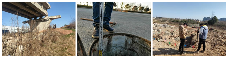 本次現(xiàn)場實測數(shù)據(jù)包含現(xiàn)狀鐵路橋橋墩坐標、橋梁凈空,已建設道路交叉口坐標及高程,已施工雨、污水井坐標及井深等,測量項目涉及到“陽邏之心”50多萬平方米二十余條道路,測量范圍廣闊,測量目標眾多,而測量人員僅為王學皓、吳修業(yè)及二十冶測量技術員陳工,實測任務異常艱巨。現(xiàn)場多為半施工或未施工道路,測量情況十分復雜,并同時遭遇武漢強降溫天氣,踏勘工作面臨極大考驗。尤其在雨污水井數(shù)據(jù)測量方面,部分道路車流量較大,需搭設臨時圍擋保證測量安全;部分重型井蓋受重載車輛碾壓密實變形,現(xiàn)有工具簡陋,僅打開井蓋這一項往往需要數(shù)十分鐘,完成單個井數(shù)據(jù)測量至少需要一個多小時,遠遠超出預估時間。與時間節(jié)點競速,測量人員踏霜踩露而出,披星戴月而歸,歷經(jīng)四天全力以赴、克難攻堅,圓滿完成所有測量任務,為設計工作順利進行提供了有力的數(shù)據(jù)支持。