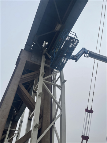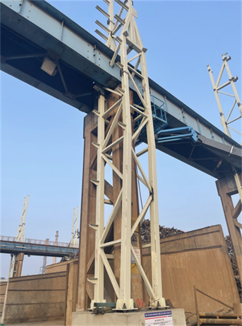 項目開工后,項目部將施工圖與現(xiàn)場實際巧妙結(jié)合,立足保證原棧橋系統(tǒng)完整、獨立運行為宗旨,攻克多項改造重點、難點。如利舊原有承臺短柱、鋼柱貫穿制動板現(xiàn)場加固、斜桿穿吊車梁腹板并規(guī)避電纜橋架等障礙物、大跨度屋面桁架梁跨外吊裝等。提前策劃好每個節(jié)點,做到現(xiàn)場施工完全落實設(shè)計意圖,實現(xiàn)了結(jié)構(gòu)安全、質(zhì)量可靠、進度可控、經(jīng)濟合理。