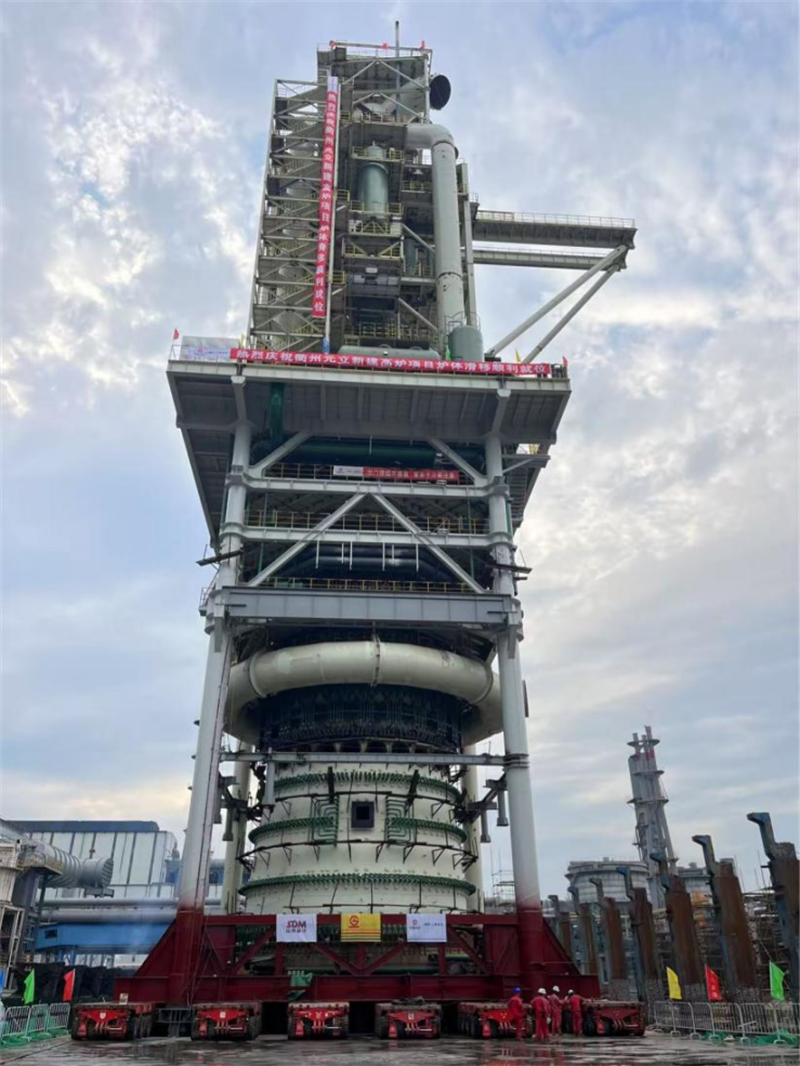 本次推移的高爐本體及爐頂設(shè)備作為高爐煉鐵核心,總重約3900噸,推移總高度達(dá)85.7m,推移距離長達(dá)115m。相對于常規(guī)高爐大修只針對爐殼滑移相比,項目團(tuán)隊大膽優(yōu)化創(chuàng)新,采用離線組裝+高爐與爐頂框架設(shè)備一體化整體滑移安裝關(guān)鍵技術(shù),啟用SPMT模塊車作為推移裝置,各道工序環(huán)環(huán)相扣,整個流程一氣呵成。