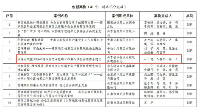 9月9日,山東省檔案館發(fā)布《關(guān)于公布全省檔案業(yè)務(wù)工作創(chuàng)新案例評(píng)選結(jié)果的通知》。其中,山冶設(shè)計(jì)申報(bào)的《以經(jīng)濟(jì)效益為核心的冶金總承包項(xiàng)目檔案標(biāo)準(zhǔn)化管理體系建設(shè)》入選“檔案服務(wù)企業(yè)高質(zhì)量發(fā)展案例”創(chuàng)新案例。此案例深入總結(jié)了山冶設(shè)計(jì)在開展總承包工程近二十年間,幾代山冶檔案人關(guān)于總承包檔案管理的經(jīng)驗(yàn),并結(jié)合公司發(fā)展需求,初步構(gòu)建起“以經(jīng)濟(jì)效益為核心的冶金總承包項(xiàng)目檔案標(biāo)準(zhǔn)化管理體系”。